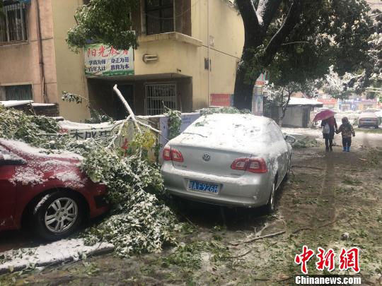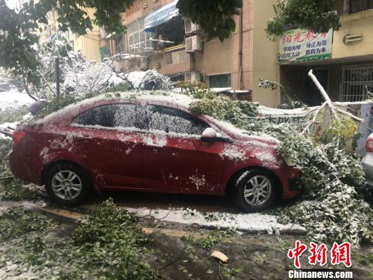 合肥一小區(qū)內(nèi),樹枝被積雪壓斷砸在路邊??康能囕v上?!≮w強(qiáng) 攝
