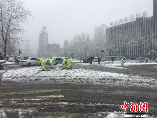 環(huán)衛(wèi)工人在鏟除積雪。 趙強(qiáng) 攝