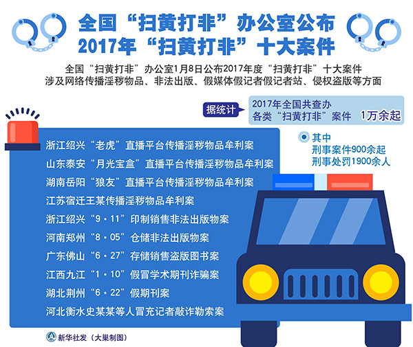 圖表:全國“掃黃打非”辦公室公布2017年“掃黃打非”十大案件 新華社發(fā) 大巢制圖