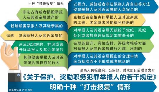 “舉報(bào)人的舉報(bào)行為可能會(huì)使違法者面臨較大數(shù)額的罰金甚至刑事處罰,因此,被舉報(bào)者可能會(huì)對(duì)舉報(bào)人及其家人進(jìn)行或明或暗的報(bào)復(fù)。”杜立元說。內(nèi)部舉報(bào)人往往是企事業(yè)單位職工、公務(wù)員等,如果保護(hù)機(jī)制不健全,就可能遭遇調(diào)換崗位等隱性報(bào)復(fù)行為。舉報(bào)人如何尋找申訴部門、如何對(duì)遭到打擊報(bào)復(fù)的舉報(bào)人進(jìn)行救濟(jì)等,都是亟需解決的問題。