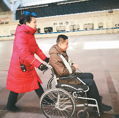 來自黑龍江齊齊哈爾的趙大哥在北京站工作人員幫助下進(jìn)站。葉聰 攝