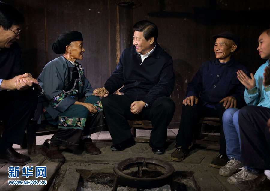 在河北阜平龍泉關(guān)鎮(zhèn)駱駝灣村困難戶唐榮斌家,習(xí)近平拿起桌上的藥瓶仔細(xì)查看,囑咐老人多多保重身體。
