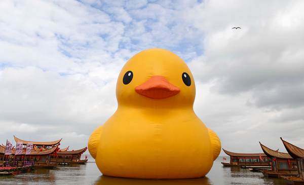 在云南省昆明市滇池邊上的古滇名城碼頭,“大黃鴨”停在畫舫旁(1月13日攝)。新華社記者 藺以光 攝