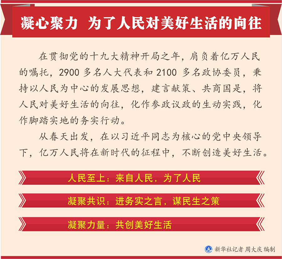在貫徹黨的十九大精神開局之年,肩負(fù)著億萬(wàn)人民的囑托,2900多名人大代表和2100多名政協(xié)委員,秉持以人民為中心的發(fā)展思想,建言獻(xiàn)策、共商國(guó)是,將人民對(duì)美好生活的向往,化作參政議政的生動(dòng)實(shí)踐,化作腳踏實(shí)地的務(wù)實(shí)行動(dòng)。
