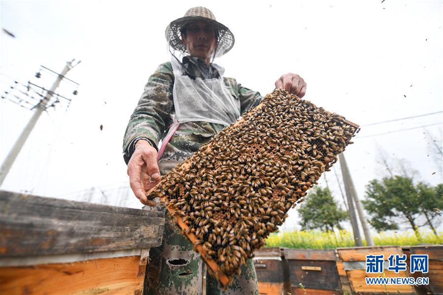 3月14日,來自安徽的蜂農(nóng)在湖北省潛江市龍灣鎮(zhèn)的油菜花地里放養(yǎng)蜜蜂。早春時節(jié),湖北省潛江市20多萬畝油菜花長勢好、流蜜足,來自全國各地的400多名養(yǎng)蜂專業(yè)戶在此收獲“甜蜜”。 新華社發(fā)(吳燕軍 攝)