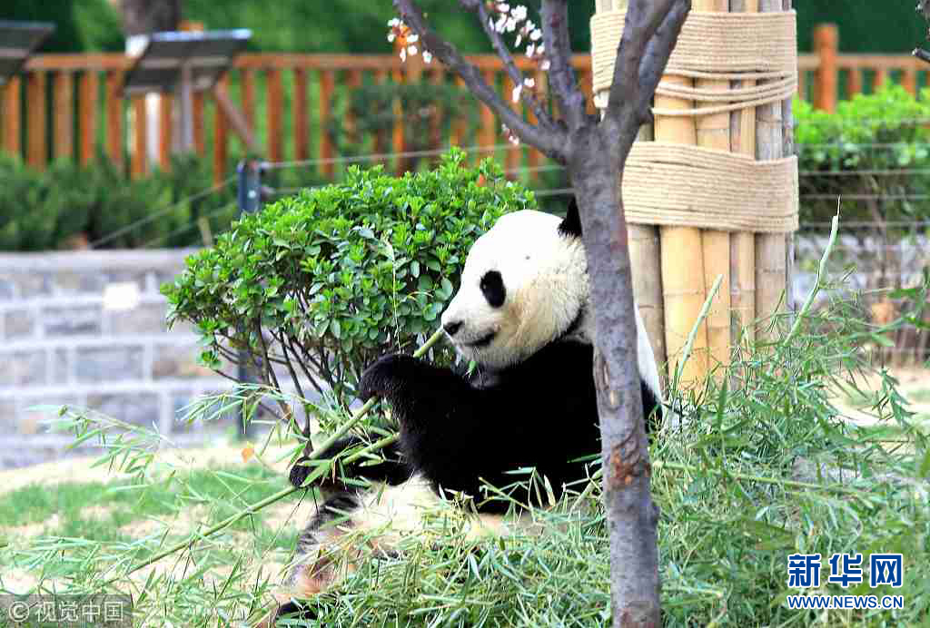 3月27日,山東濟南春暖花開,動物園內(nèi)熊貓在園中散步吃美食享受春天美好陽光。(圖片來源:視覺中國)