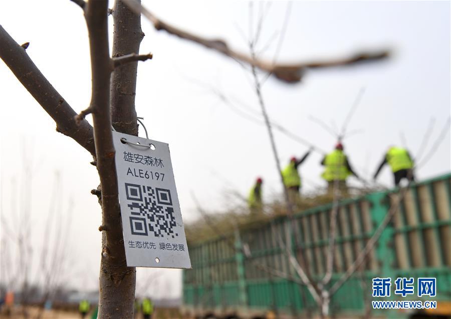 這是河北雄安新區(qū)“千年秀林”栽植苗木上的二維碼(3月21日攝)。新華社記者 牟宇 攝