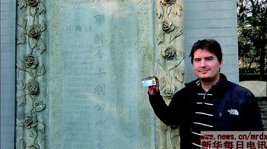 清華大學留學生西泰拿出帶有自己名字的學生證與利瑪竇墓碑合影。