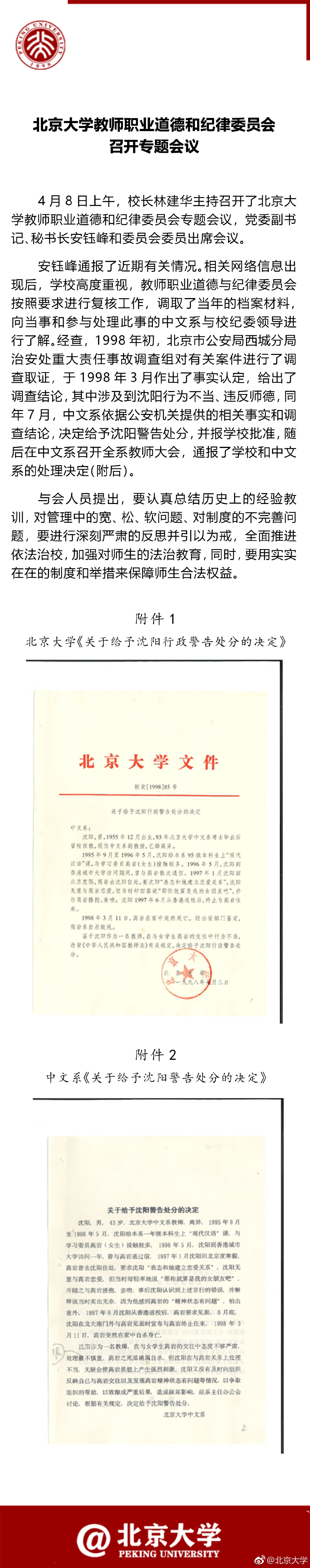 據(jù)北京大學(xué)官方微博消息,北京大學(xué)教師職業(yè)道德和紀(jì)律委員會今日召開專題會議 ,通報“沈陽事件”,并出示了當(dāng)年對其警告處分的決定。