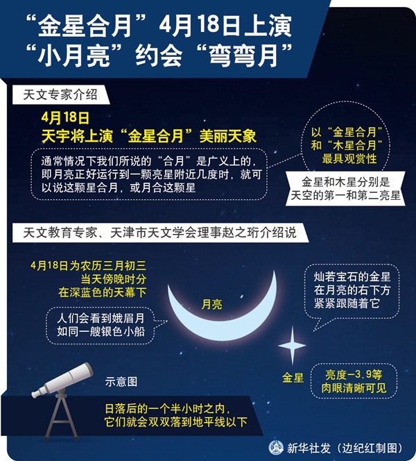 天文教育專家、天津市天文學(xué)會(huì)理事趙之珩介紹說(shuō),18日為農(nóng)歷三月初三,當(dāng)天傍晚時(shí)分,在深藍(lán)色的天幕下,人們會(huì)看到娥眉月如同一艘銀色小船,燦若寶石的金星在月亮的右下方緊緊跟隨著它。星月交輝,形影相隨,為暮春的天宇增添精彩。