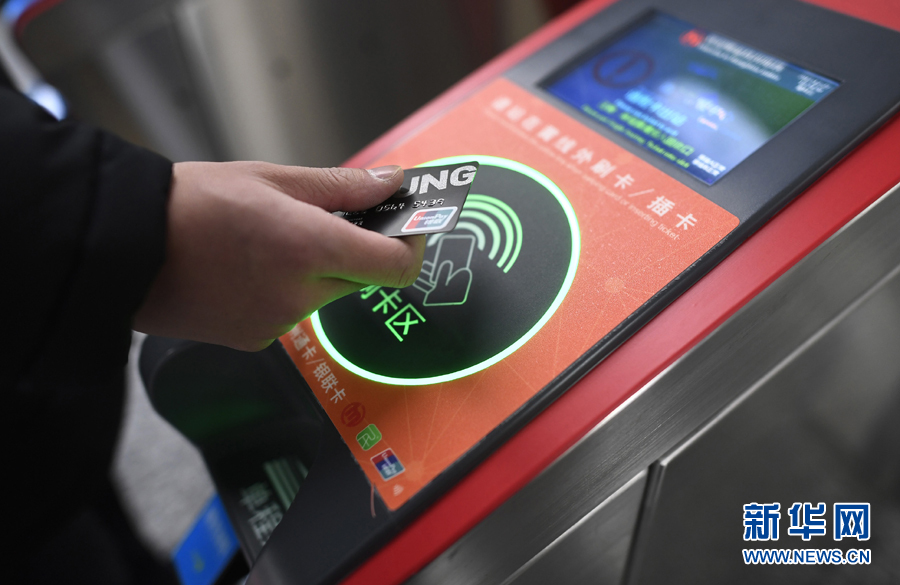 乘客在杭州地鐵豐潭路站體驗使用帶有閃付功能的銀聯(lián)IC卡過閘乘車(2017年12月27日攝)。新華社記者 黃宗治 攝