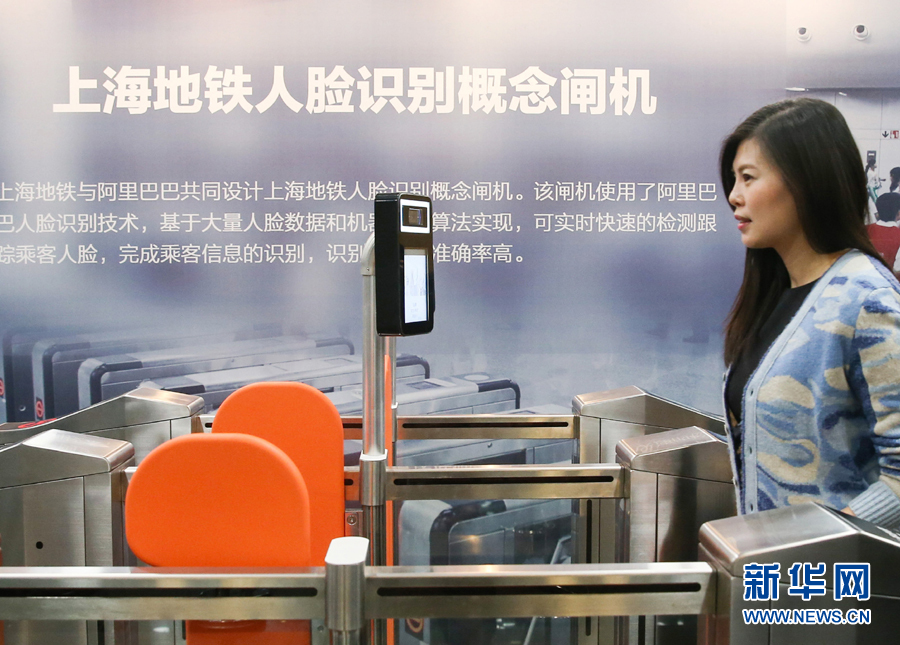 在上海申通地鐵集團有限公司,工作人員在現(xiàn)場體驗刷臉進站技術(shù)(2017年12月5日攝)。新華社記者 丁汀 攝