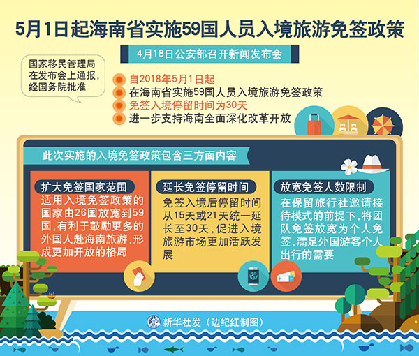 “擴(kuò)大免簽國范圍;延長免簽停留時間;放寬免簽人數(shù)限制。”18日,公安部在京召開新聞發(fā)布會,國家移民管理局在發(fā)布會上通報,經(jīng)國務(wù)院批準(zhǔn),自2018年5月1日起,在海南省實施59國人員入境旅游免簽政策,進(jìn)一步支持海南全面深化改革開放。
