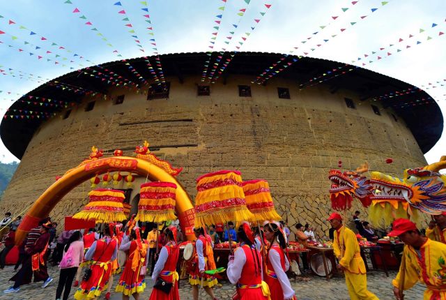 人們?cè)诟=ㄊ∪A安縣仙都鎮(zhèn)大地土樓群的“土樓之王”——二宜樓里舉行“三月三”民俗文化活動(dòng)。 新華社記者 魏培全 攝