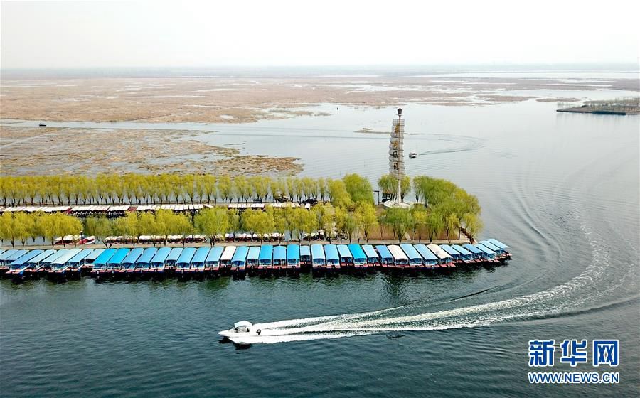 一艘游船在白洋淀景區(qū)旅游碼頭內(nèi)行駛。新華社記者 牟宇 攝