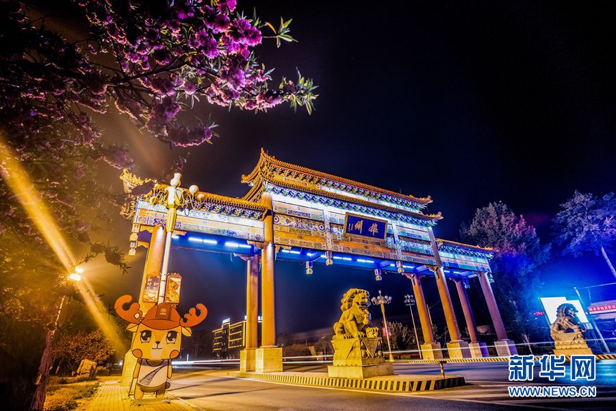 夜幕中的春花與雄縣牌樓相互印襯。中國雄安官網(wǎng)記者 王永康 攝