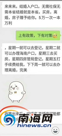 4月22日晚,海南省政府召開(kāi)《中共海南省委辦公廳海南省人民政府辦公廳關(guān)于進(jìn)一步穩(wěn)定房地產(chǎn)市場(chǎng)的通知》新聞發(fā)布會(huì),公布全省實(shí)施全域限購(gòu)。隨即,朋友圈流傳“星期一登記結(jié)婚、星期二辦理海南戶口、星期三買(mǎi)房、星期四登記(結(jié)婚)、星期五打(假結(jié)婚)手續(xù)費(fèi)、下周一離婚”等傳言和段子。南海網(wǎng)記者從海南省公安廳、??谑忻裾值炔块T(mén)了解到,此類(lèi)登記結(jié)婚就可立即辦理落戶海南等傳言均不可能實(shí)現(xiàn)。