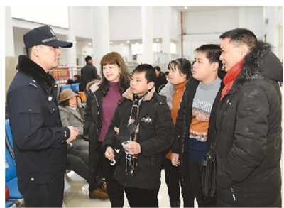 二月九日,民警在僑鄉(xiāng)浙江青田火車站為歸國返鄉(xiāng)華僑介紹乘車安全注意事項。新華社記者 黃宗治 攝