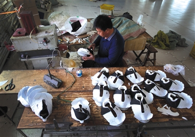 2017年4月28日,河北省安新縣崔公堤村,位于白洋淀以西,村內(nèi)鞋廠眾多,工人正在加工鞋面。新京報(bào)記者 王貴彬 攝