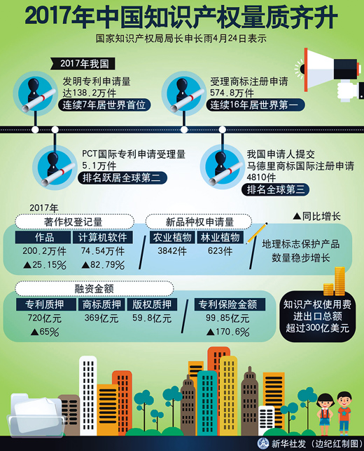 隨著中國(guó)經(jīng)濟(jì)迅速發(fā)展和創(chuàng)新能力的提高,加強(qiáng)知識(shí)產(chǎn)權(quán)保護(hù)愈加顯得迫切。對(duì)此,不僅外資企業(yè)有要求,中國(guó)企業(yè)更有要求。2017年,中國(guó)國(guó)家知識(shí)產(chǎn)權(quán)局共受理發(fā)明專利申請(qǐng)138.2萬件,其中國(guó)內(nèi)申請(qǐng)超過90%;商標(biāo)申請(qǐng)量達(dá)到574.8萬件,其中國(guó)內(nèi)申請(qǐng)量占到96.36%,顯示了國(guó)內(nèi)市場(chǎng)主體和創(chuàng)新主體對(duì)加強(qiáng)知識(shí)產(chǎn)權(quán)保護(hù)的強(qiáng)烈需求。