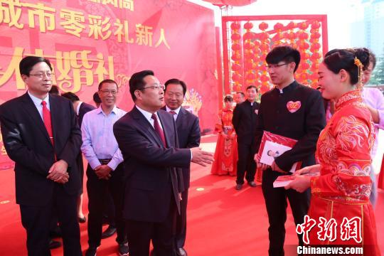5月4日是五四青年節(jié),當日上午,以“新時代、新青年、新風尚”為主題的河南永城市2018“零彩禮”新人集體婚禮在該市人民廣場隆重舉行。來自全市的18對新人以“零彩禮”集體婚禮的形式步入幸福的婚姻殿堂,致敬青春。
