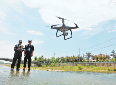 5月17日,浙江省杭州市臨安區(qū)天目山鎮(zhèn),河道管護(hù)隊(duì)員在操作無(wú)人機(jī)巡河。胡劍歡攝(人民視覺(jué))