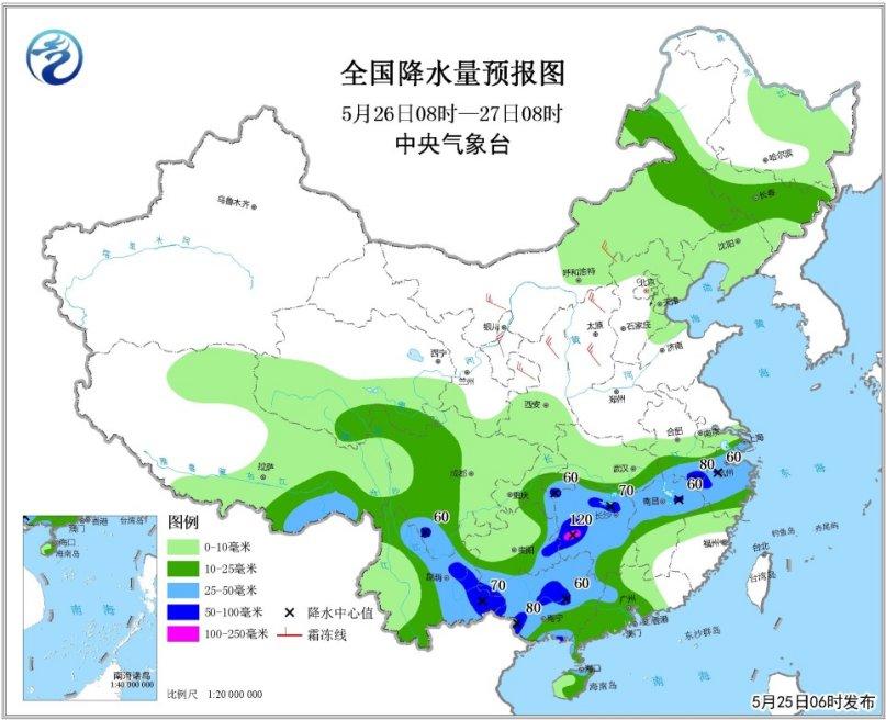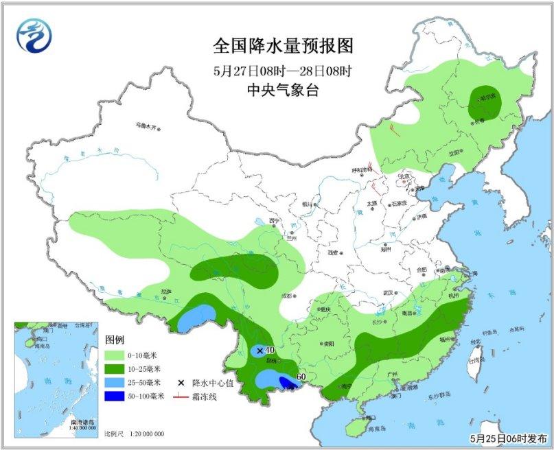 全國降水量預(yù)報圖(5月25日08時-26日08時)