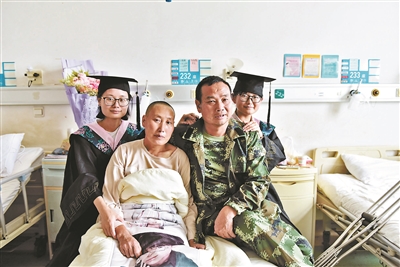 由于母親周玉梅需要在病床上休息,經(jīng)過醫(yī)生同意后,李夢楠花20元為母親租了輪椅,在醫(yī)院的樓道和病房里與同學(xué)們一起拍了合影。照片里,周玉梅戴上了女兒的學(xué)士帽,微笑著面對鏡頭。