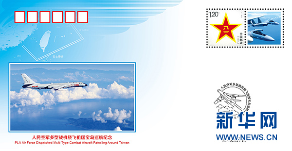 這次發(fā)行的一套兩枚中英文版紀(jì)念封,是中國(guó)集郵總公司根據(jù)新華社公開(kāi)播發(fā)的有關(guān)報(bào)道和新聞?wù)掌O(shè)計(jì)制作,記錄了空軍轟-6K等多型戰(zhàn)機(jī)多次繞飛祖國(guó)寶島巡航的航跡。
