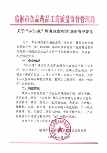 情況說明指出,近日,部分網(wǎng)媒平臺(tái)相繼出現(xiàn)“味知爽”牌長沙臭豆腐配料表中含“屎”的新聞,臨湘市食品藥品工商質(zhì)量監(jiān)督管理局第一時(shí)間組織執(zhí)法人員進(jìn)行了現(xiàn)場(chǎng)調(diào)查核實(shí)。