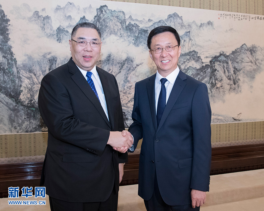 6月28日,中共中央政治局常委、國(guó)務(wù)院副總理韓正在北京中南海紫光閣會(huì)見澳門特別行政區(qū)行政長(zhǎng)官崔世安。 新華社記者王曄攝