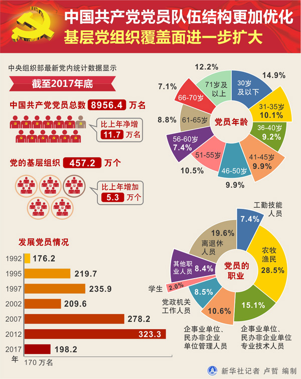 圖表:中國(guó)共產(chǎn)黨黨員隊(duì)伍結(jié)構(gòu)更加優(yōu)化 基層黨組織覆蓋面進(jìn)一步擴(kuò)大 新華社記者 盧哲 編制