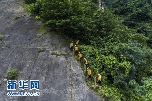 “蜘蛛俠”們穿過雜樹叢爬上陡坡準(zhǔn)備作業(yè)。新華網(wǎng) 王頔攝