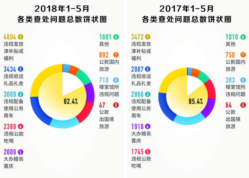2017年、2018年1-5月各類(lèi)查處問(wèn)題總數(shù)餅狀圖,違規(guī)發(fā)放津補(bǔ)貼或福利、違規(guī)收送禮品禮金、違規(guī)配備使用公務(wù)用車(chē)、違規(guī)公款吃喝、大辦婚喪喜慶等“老問(wèn)題”占比較大,均超80%