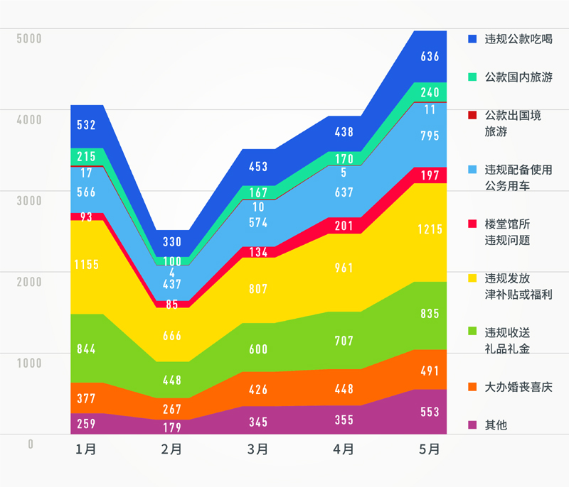 再來看,違反中央八項規(guī)定精神問題類型。從1至5月各類查處問題的面積分布圖來看,各類具體問題的查處趨勢也保持了較穩(wěn)定的增長態(tài)勢。值得注意的是,違規(guī)發(fā)放津補貼或福利、違規(guī)收送禮品禮金、違規(guī)配備使用公務(wù)用車、違規(guī)公款吃喝、大辦婚喪喜慶等問題類型,相比同期仍是所有問題類型的“大頭”(占據(jù)前5名),占比仍超80%。數(shù)據(jù)顯示,這些老問題,仍需下大氣力糾治,持之以恒,久久為功。