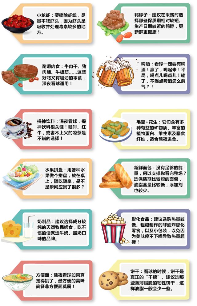 小編溫馨提示:球隊是別人家的,身體可是咱自己的,“爽了嘴傷了胃”,著實不劃算。深夜看球,不僅要吃的美味,更要吃的健康!下面為吃貨們送上一份健康飲食攻略圖。