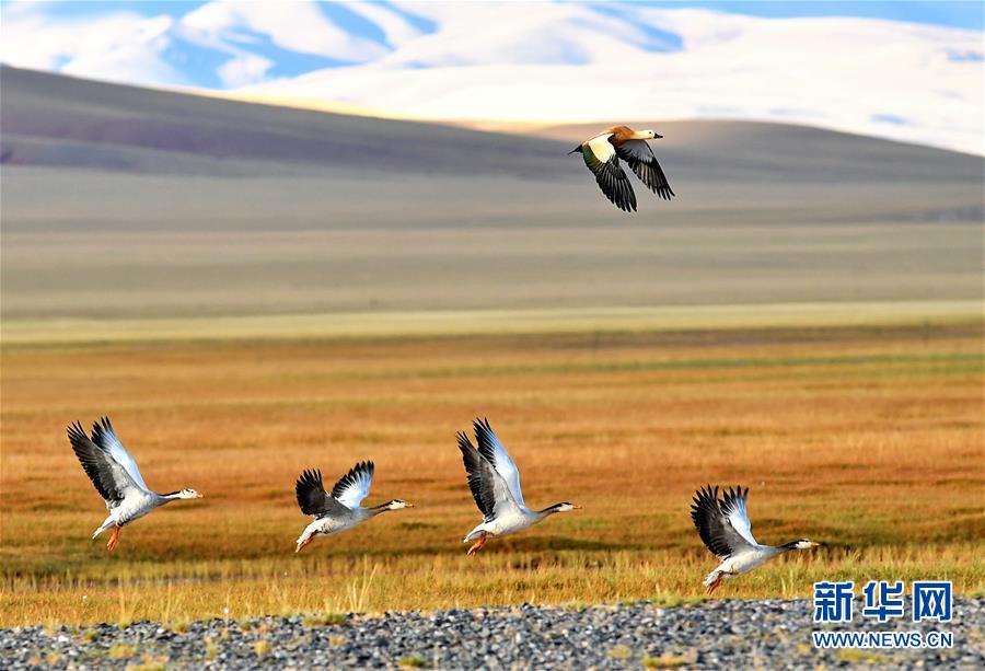 一只赤麻鴨(上)和一群斑頭雁在西藏尼瑪縣那若塘濕地上飛翔(2017年9月19日攝)。新華社記者 張汝鋒 攝