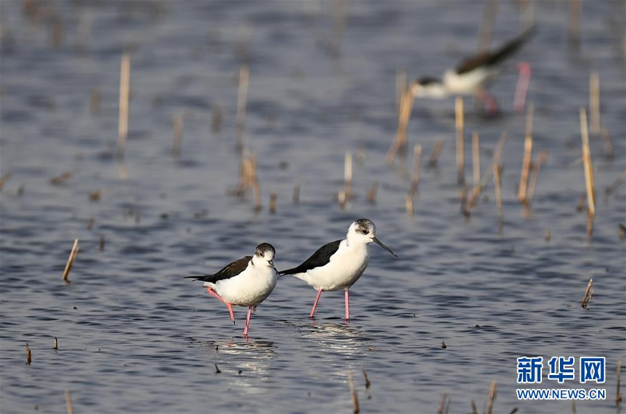 幾只黑翅長腳鷸在內(nèi)蒙古呼和浩特市土默特左旗境內(nèi)的哈素海濕地覓食(2018年4月24日攝)。新華社記者 彭源 攝