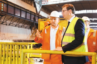 塞爾維亞總統(tǒng)武契奇7月5日出席河鋼塞爾維亞有限公司為正式接管斯梅代雷沃鋼鐵廠兩周年舉行的慶典時(shí)表示,中國公司的收購讓該廠獲得成功和進(jìn)步。斯梅代雷沃鋼鐵廠成立于1913年,曾一度面臨倒閉。2016年,中國河鋼集團(tuán)收購該廠。當(dāng)年底,實(shí)現(xiàn)盈利。圖為武契奇(右)視察河鋼塞爾維亞有限公司。新華社記者 王慧娟攝