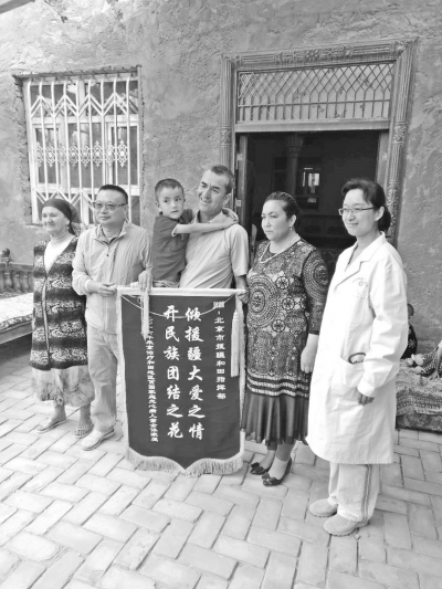 圖為北京援疆醫(yī)生登門看望和田縣布扎克鄉(xiāng)先心病兒童赴京救治后康復情況,收到當?shù)鼐S吾爾族群眾送上的錦旗。本報記者余向東文/圖