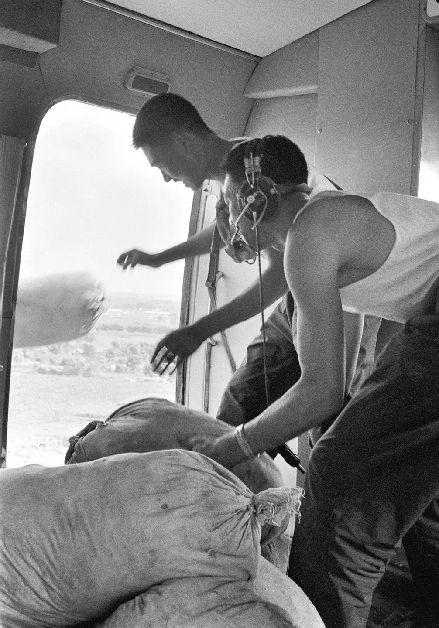人民解放軍把祖國各地人民支援災(zāi)區(qū)的抗震救災(zāi)物資,空投給災(zāi)區(qū)人民群眾。(1976年8月1日發(fā))新華社記者 韓曉華 攝