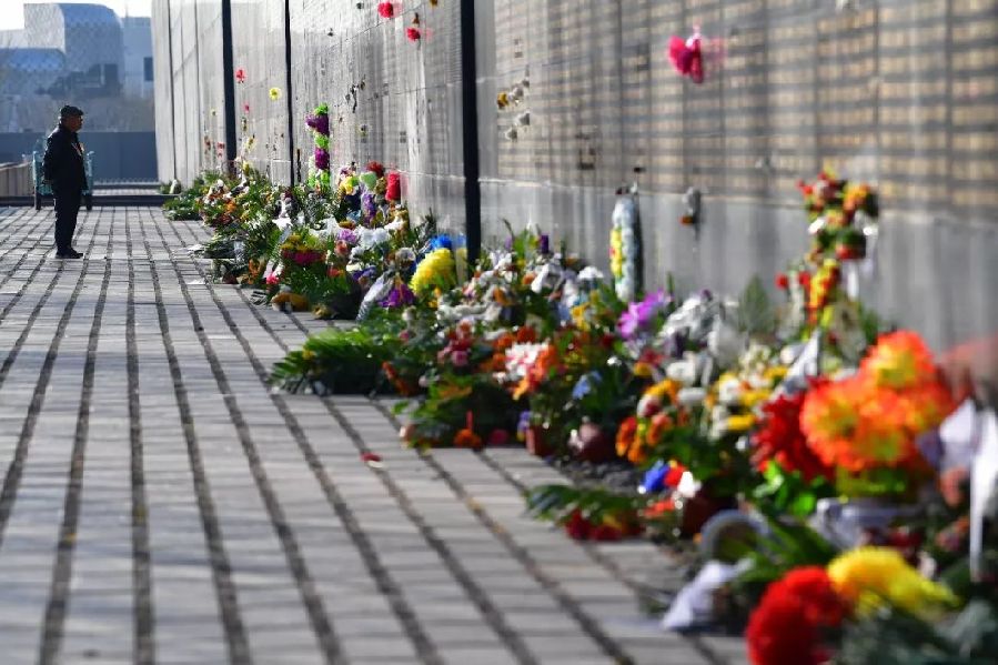 2018年4月4日,一名市民在唐山地震紀(jì)念墻前悼念逝者。新華社發(fā)(董鈞 攝)
