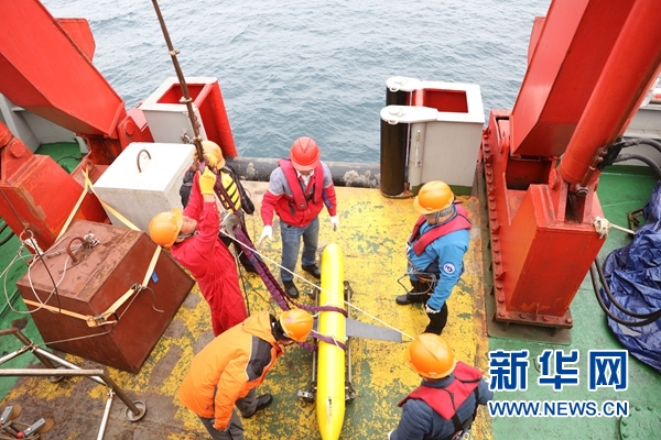 北京時(shí)間28日5時(shí)23分,考察隊(duì)隊(duì)員們將“海翼”號(hào)水下滑翔機(jī)緩緩送入海中。在成功入海后,“海翼”號(hào)開(kāi)始對(duì)所在海域執(zhí)行剖面觀測(cè)。