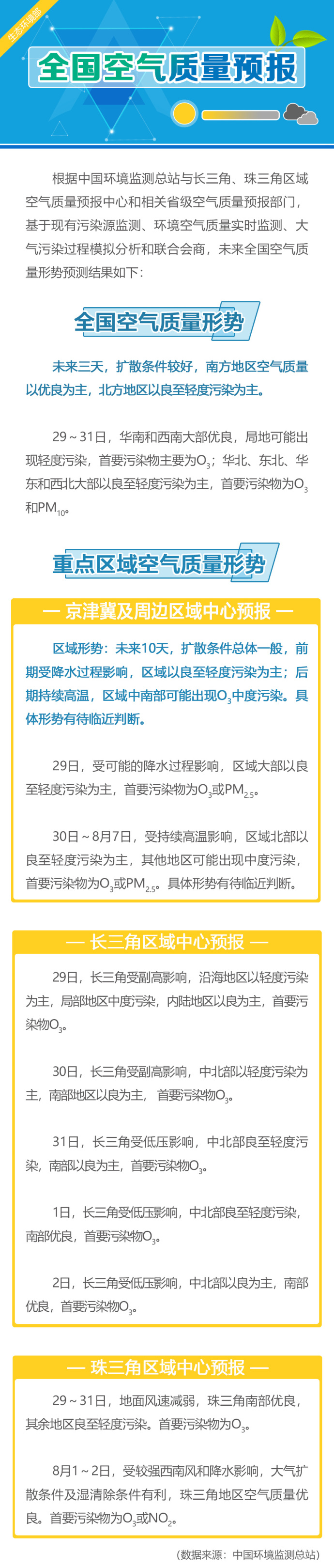 據(jù)生態(tài)環(huán)境部官方微博消息,未來(lái)3天(7月29-31日),擴(kuò)散條件較好,南方地區(qū)空氣質(zhì)量以優(yōu)良為主,北方地區(qū)以良至輕度污染為主。