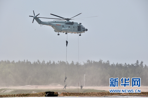 7月29日,在福建泉州賽區(qū)開幕式上,中國海軍陸戰(zhàn)隊(duì)在三棲立體登陸作戰(zhàn)課目軍事表演中搭乘艦載直升機(jī)滑降。當(dāng)日,“國際軍事比賽-2018”中國承辦賽事開幕式分別在新疆庫爾勒市和福建泉州市舉行。 新華社記者 姜克紅 攝
