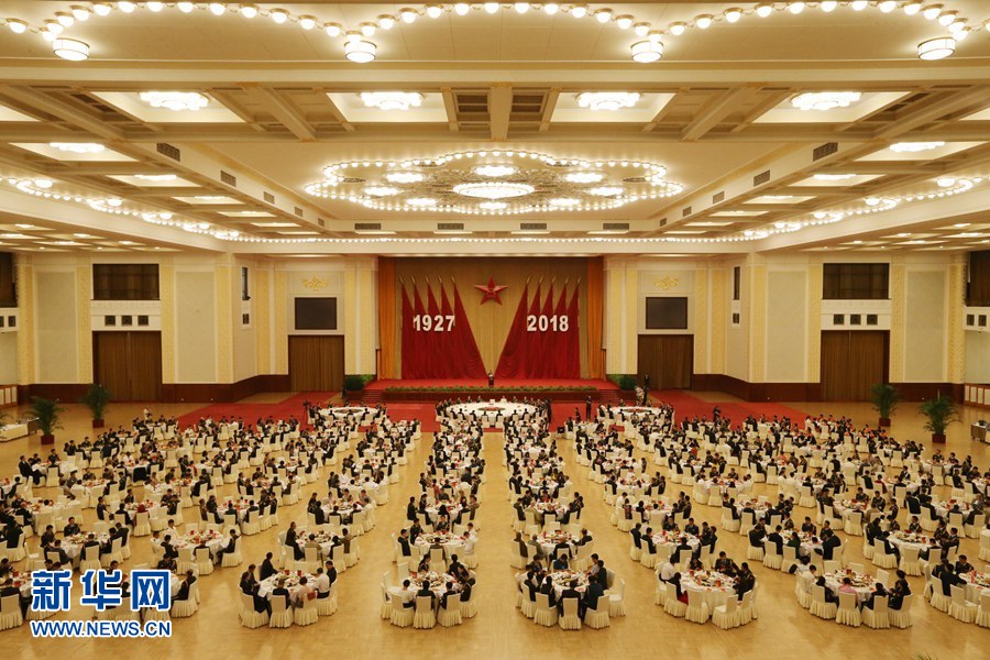 人民大會(huì)堂燈火輝煌、鮮花綻放,中外嘉賓歡聚一堂、共慶節(jié)日。主席臺(tái)帷幕中央懸掛著巨型“八一”軍徽,十面鮮艷的紅旗分立兩側(cè)。“1927-2018”醒目的大字熠熠生輝,昭示著中國(guó)人民解放軍走過(guò)了91年的光輝歲月,走進(jìn)新時(shí)代,踏上新征程。
