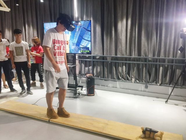 在山路騎行體驗(yàn)區(qū),體驗(yàn)者需佩戴VR眼鏡騎車,屏幕上的山路場景會(huì)隨移動(dòng)轉(zhuǎn)換,時(shí)而上坡、時(shí)而急轉(zhuǎn)彎、時(shí)而平緩……車身也會(huì)隨場景左右擺動(dòng)。在高空涉險(xiǎn)體驗(yàn)區(qū),參與者小心翼翼的在平地上移動(dòng)著腳步,原來在vr的世界里面,體驗(yàn)者正站在高樓外狹窄的木板上試圖“營救”蜷縮在木板盡頭的“虛擬”小貓。