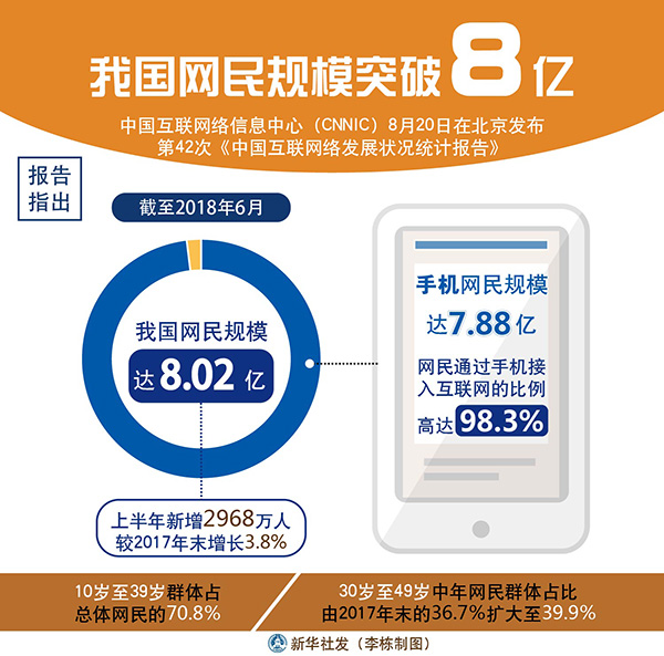 新華社北京8月20日電(記者王思北、施雨岑)中國互聯(lián)網(wǎng)絡(luò)信息中心(CNNIC)20日在京發(fā)布第42次《中國互聯(lián)網(wǎng)絡(luò)發(fā)展?fàn)顩r統(tǒng)計(jì)報(bào)告》。報(bào)告指出,截至2018年6月,我國網(wǎng)民規(guī)模達(dá)8.02億,上半年新增網(wǎng)民2968萬人,較2017年末增長(zhǎng)3.8%,互聯(lián)網(wǎng)普及率達(dá)57.7%;手機(jī)網(wǎng)民規(guī)模達(dá)7.88億,網(wǎng)民通過手機(jī)接入互聯(lián)網(wǎng)的比例高達(dá)98.3%。