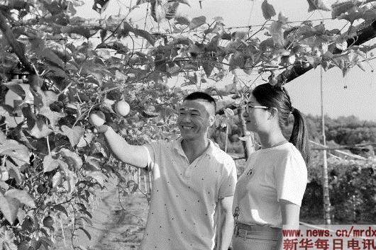 武平縣返鄉(xiāng)創(chuàng)業(yè)大學(xué)生王秀珍(右)與合作種植的果農(nóng)一起查看百香果的生長情況。(本報(bào)記者郭圻攝)