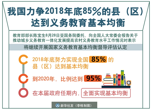 新華社北京8月28日電(記者胡浩)教育部部長陳寶生28日受國務(wù)院委托,向全國人大常委會(huì)報(bào)告關(guān)于推動(dòng)城鄉(xiāng)義務(wù)教育一體化發(fā)展提高農(nóng)村義務(wù)教育水平工作情況時(shí)表示,將繼續(xù)開展國家義務(wù)教育基本均衡督導(dǎo)評(píng)估認(rèn)定,2018年底努力實(shí)現(xiàn)全國85%的縣(區(qū))達(dá)到基本均衡,到2020年,比例達(dá)到95%;在本屆政府任期內(nèi),全面實(shí)現(xiàn)基本均衡。